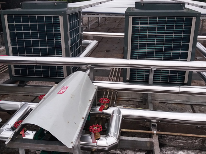 工程明細:18組太陽能集熱模塊,3臺5匹空氣能熱水機,2個8噸不銹鋼保溫水箱