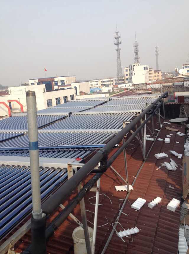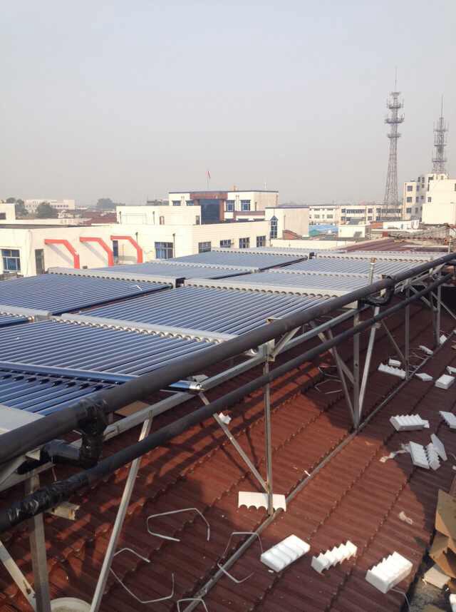 工程介紹:6組太陽能集熱模塊,1臺3噸不銹鋼保溫水箱,配置12KW電加熱進行輔助加熱。